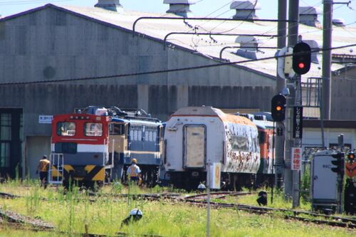 本日(8/4)9時頃の長野総合車両センター廃車置場の様子です。前回訪問時と変化はありませんでしたが、この後に大きな動きがありました。 私が居た午前中の時点では、工場留置線(廃車置場)に残ったのはEF65 1105とDD16 11のみです。第二製作工場へは、ED60…