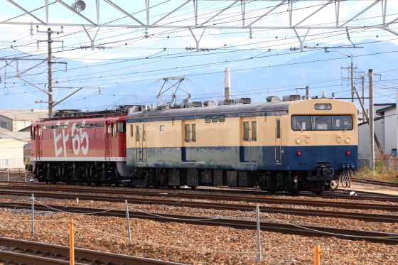 2015-11-27 EF65-1118廃車置場へ 長野総合車両センター 昨夜、長野総合車両センターに配給されたEF65-1118ですが、本日の午前中にクモユニ143-3に牽引されて工場線へ移動しました。その後、スイッチャーによって廃車置場へ移動し、EF65-1107の前に連結されて留置されました。 クモユニ143-3によって移動するEF65-1118 向きを変えて工場線へ入ります。 このデザインも見納め・・・ EF65-1118サイド EF65-1118とクモユニ143-3の連結部 工場線へ押し込まれます 続いてスイッチャーに引かれ移動 廃車置場に押し込まれます EF65-1107の前に連結され少し押し込まれます 移動完了 移動完了後の廃車置場の様子 反対側へも行ってみました(脚立に乗りライブビュー機能を使い頭上で撮影) 回送車票も残されています。