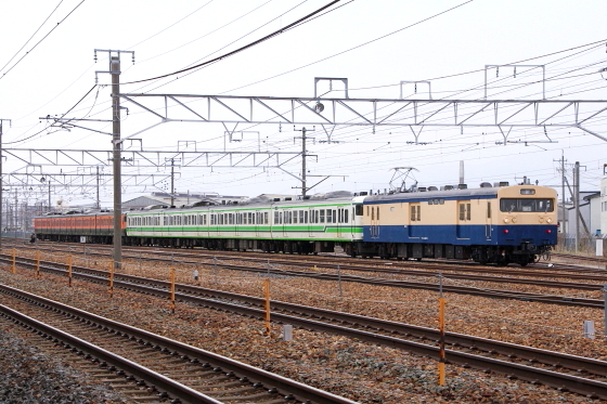 2016-04-21 115系新潟車L9編成+L10編成が廃車置場へ 長野総合車両センター #鉄道、列車 日が変わって今日の深夜に長野総合車両センターに配給されてきた、115系新潟車L9編成(湘南色)+L10編成が、クモユニ143-3によって留置線から工場線へ移動しました。その後、スイッチャーによって廃車置場に移動しました。 クモユニ143-3に牽引されて移動する115系L9編成(湘南色)+L10編成 所定位置まで進みます 向きを変えてL9編成(湘南色)が先頭で工場線へ 115系N15編成「訓練車」が見守ります L9編成(湘南色)+L10編成の連結部 L10編成とクモユニ143-3連結部 工場線へ押し込まれます 続いてスイッチャーで引き出されます スイッチャーで試運転まで引き出され まずは、L9編成を押し込みます 続いてL10編成のみ引き出します L10編成は、L9編成の隣へ押し込まれます これで、今回の移動は完了です 14:20頃の廃車置場の様子です 別角度からの廃車置場の様子